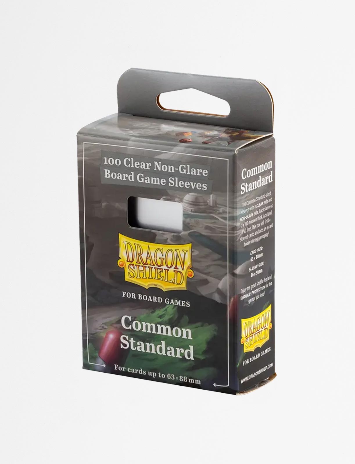 The unique combination of both a Clear and a Non-Glare side ensures a great smooth shuffle, while letting you decide which side to use for the front or back of the card depending on your gaming preference. Our Dragon Shield board game sleeves in Common Standard size: