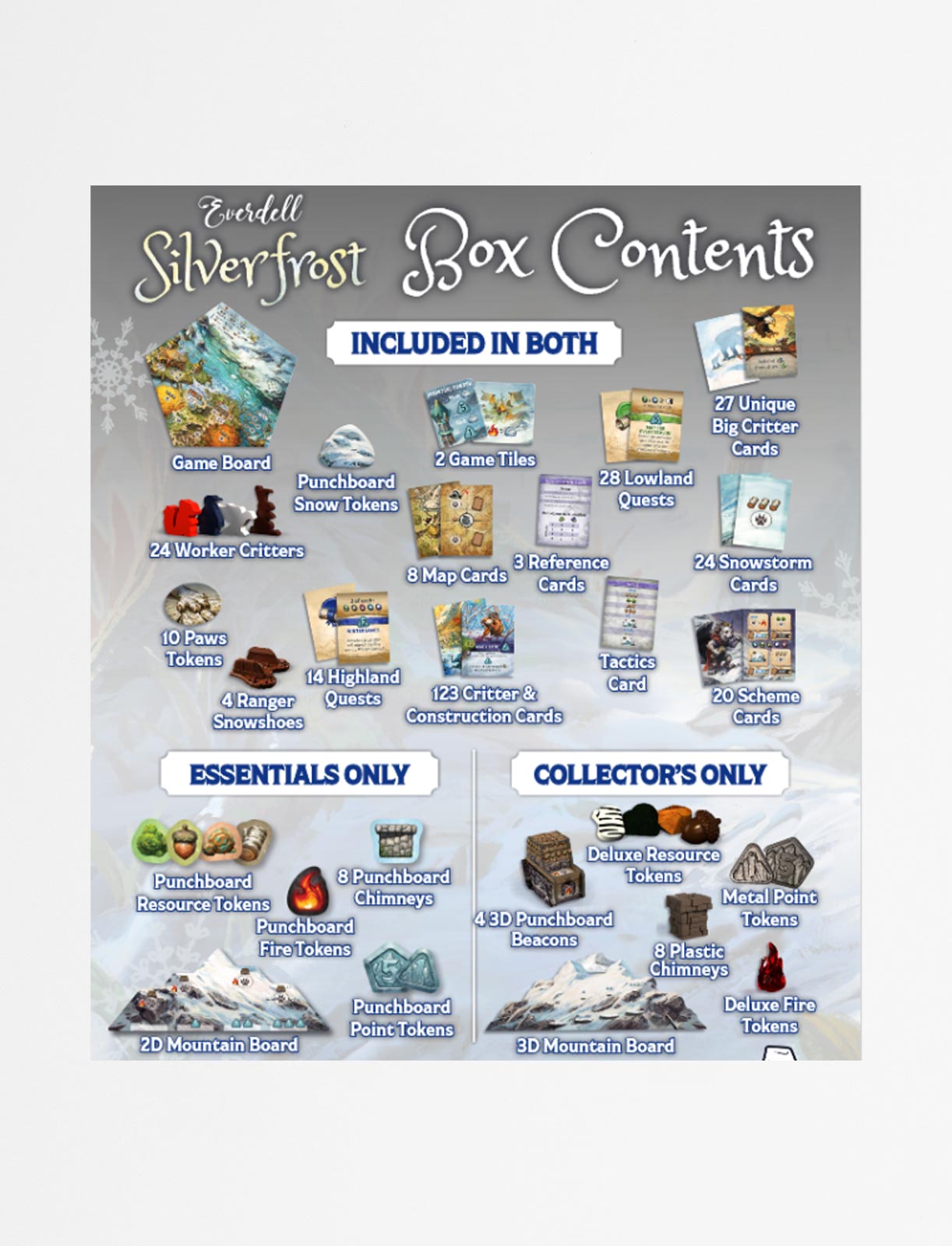 Bak de snødekte Spirecrest-fjellene sør for Everdell-dalen ligger det dristige landet Silverfrost. Det er din oppgave å bygge og vedlikeholde en by i dette utfordrende landskapet. Du må rydde den hopende snøen, brenne bålene for å holde innbyggerne dine varme, og fullføre viktige oppdrag for Ranger’s Guild.