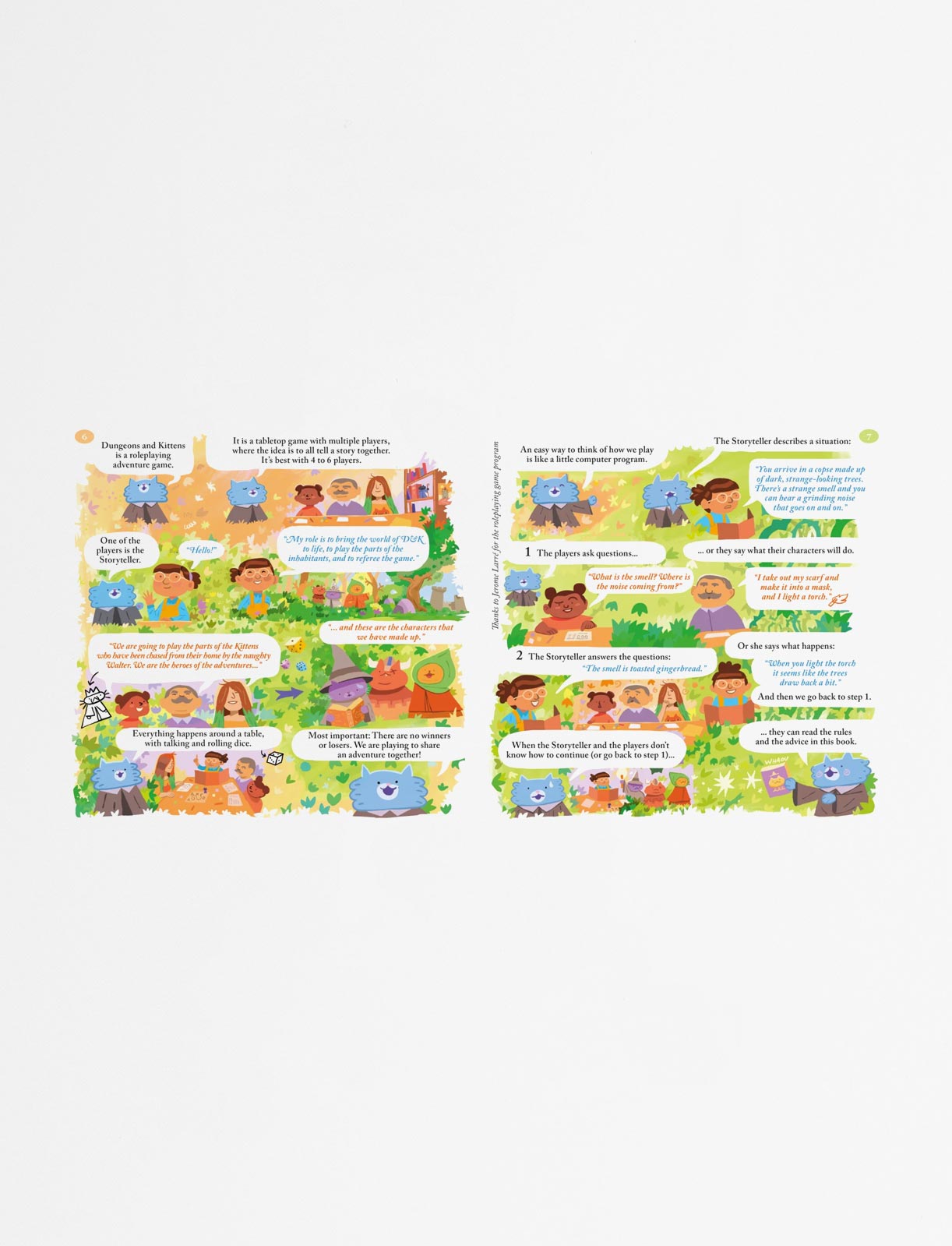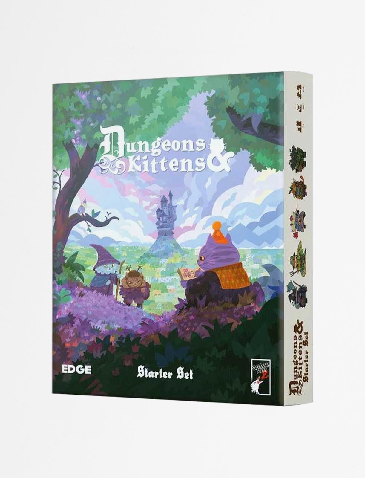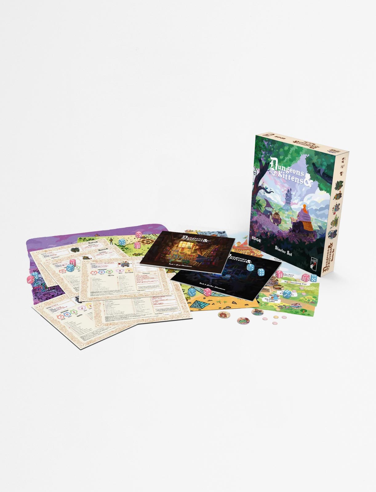 This box contains all you need to discover, step by step, the world and the rules of Dungeons and Kittens, the Adventure Game: