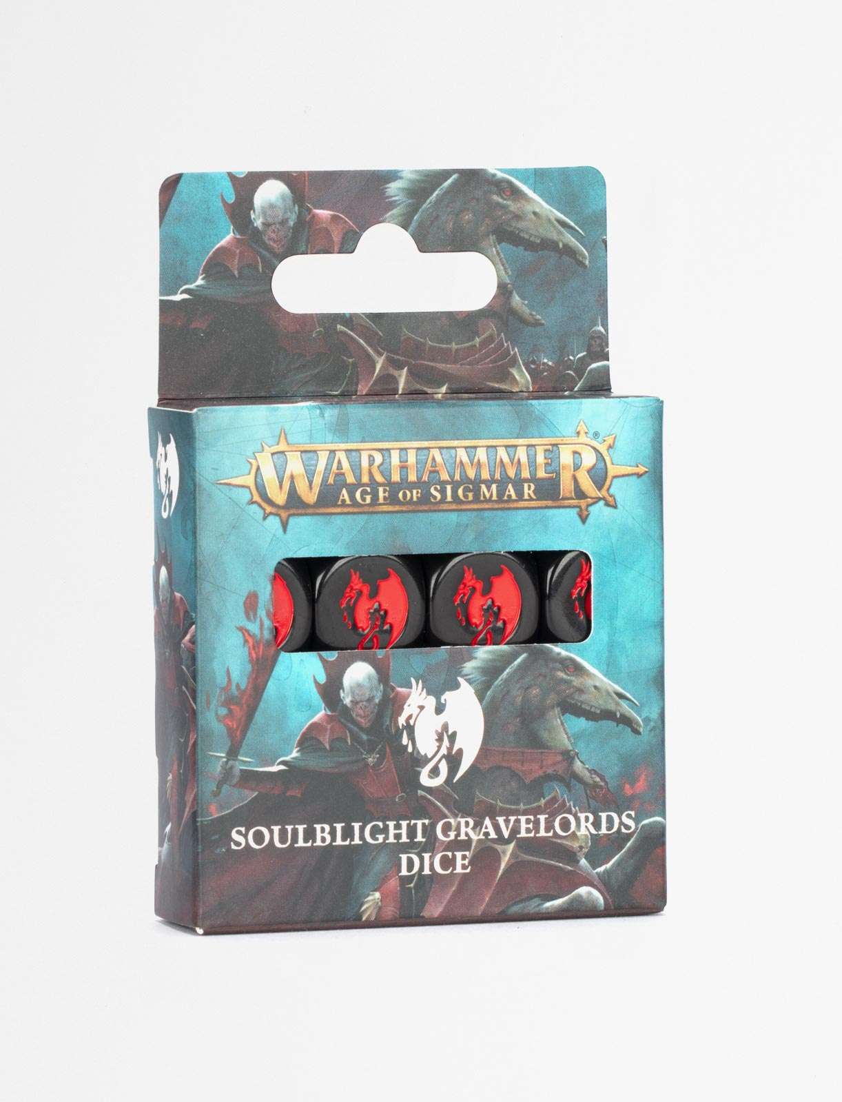 Bless your rolls with powerful death magic using this set of 16 dice. They are coloured black with red ink and feature the symbol of the Soulblight Gravelords on the six face.
